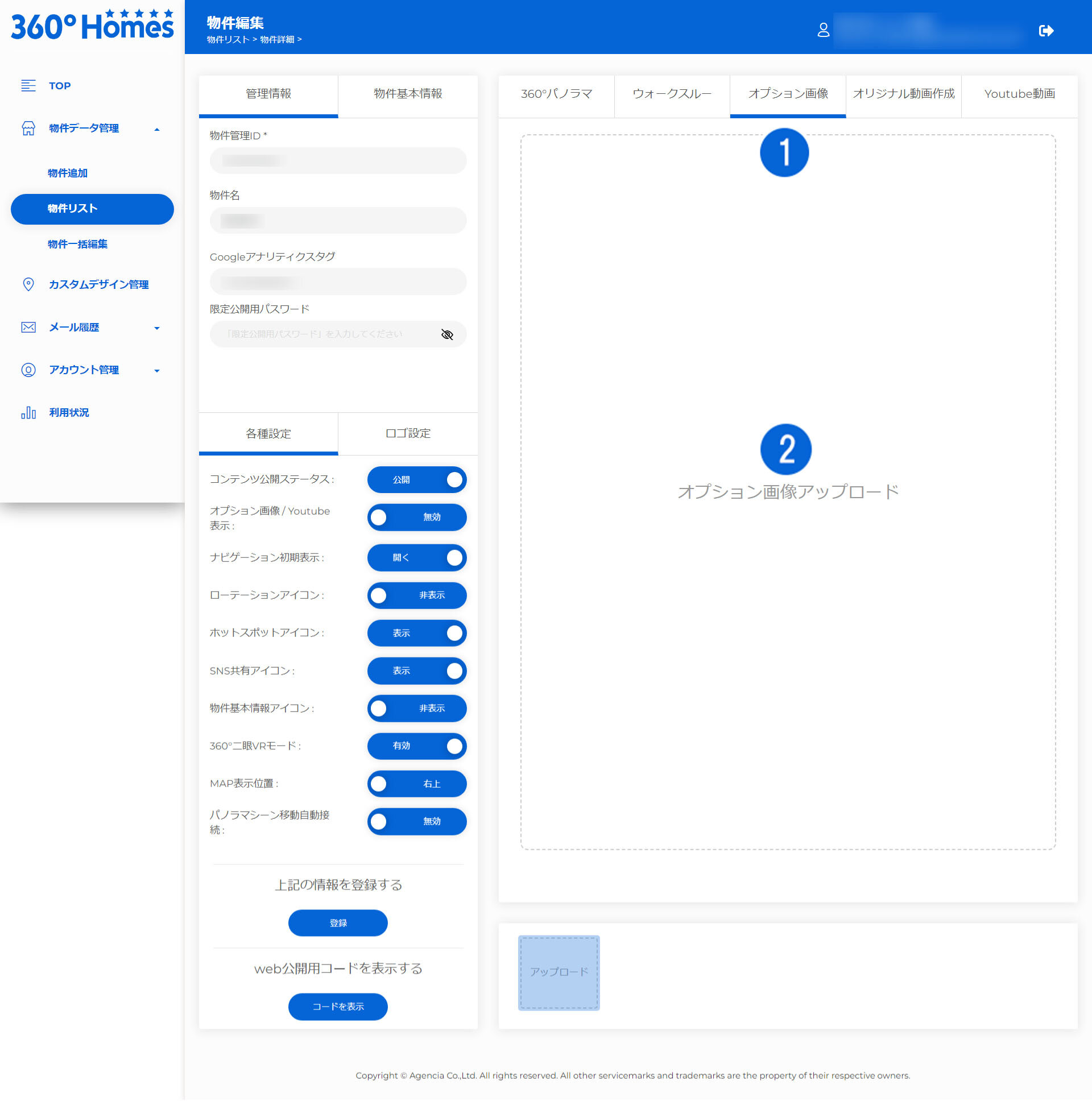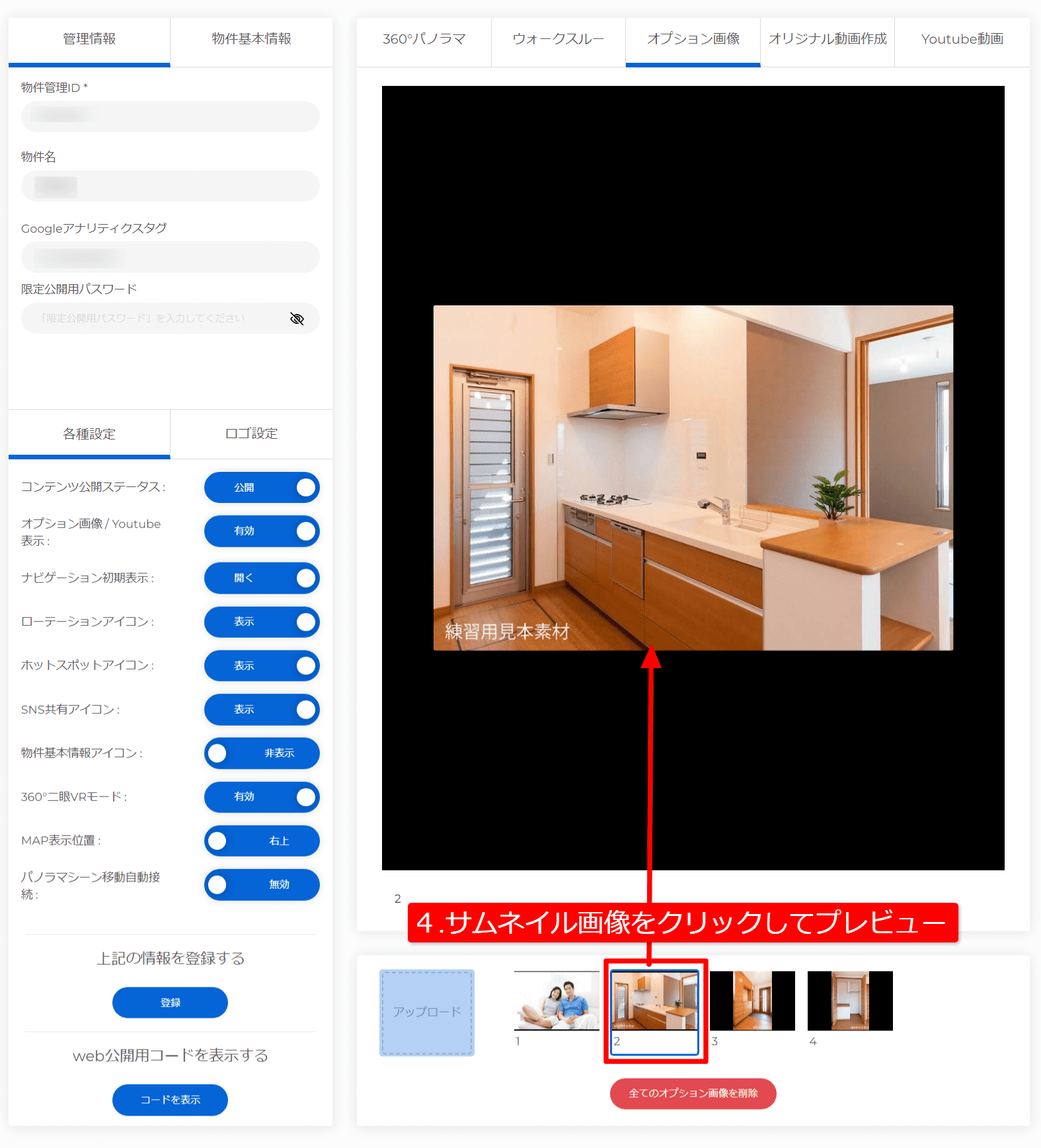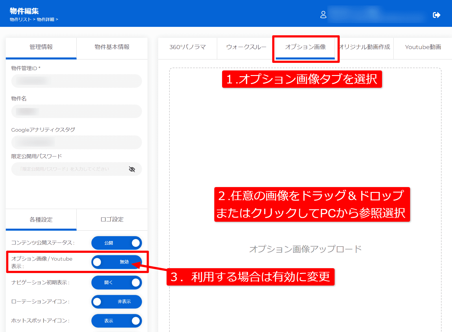 ① オプション画像:物件内装の360パノラマ°画像と別に、設備や外観などの通常の写真やイラスト画像を掲載することができます。