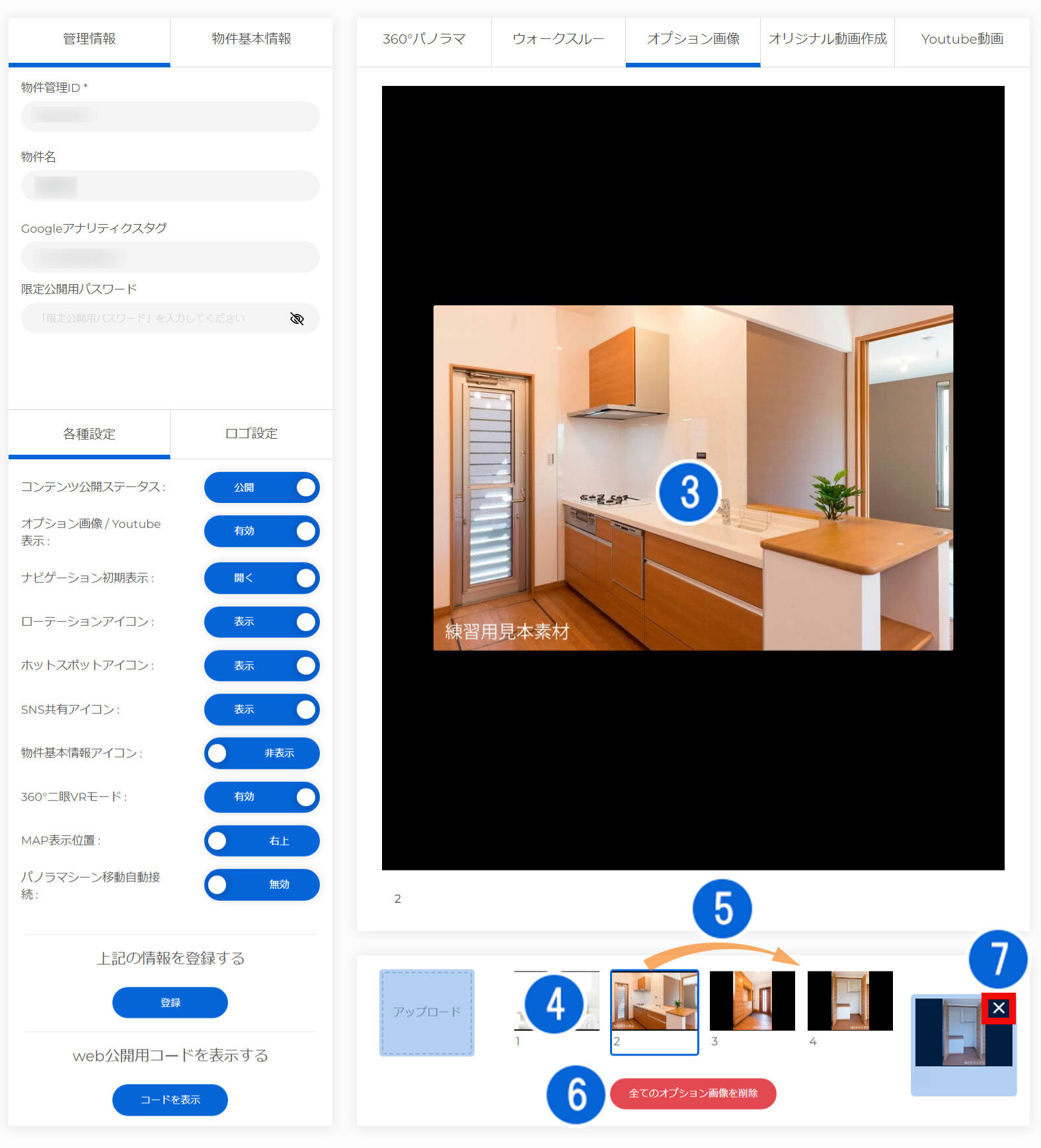 ⑦ パノラマ削除:1点のみパノラマ画像を削除する場合は、サムネイル右上にマウスオンをして、✖をクリックして削除ができます。
