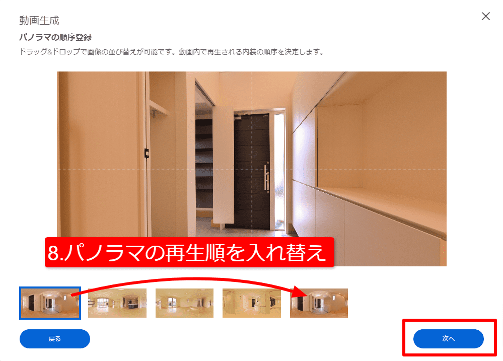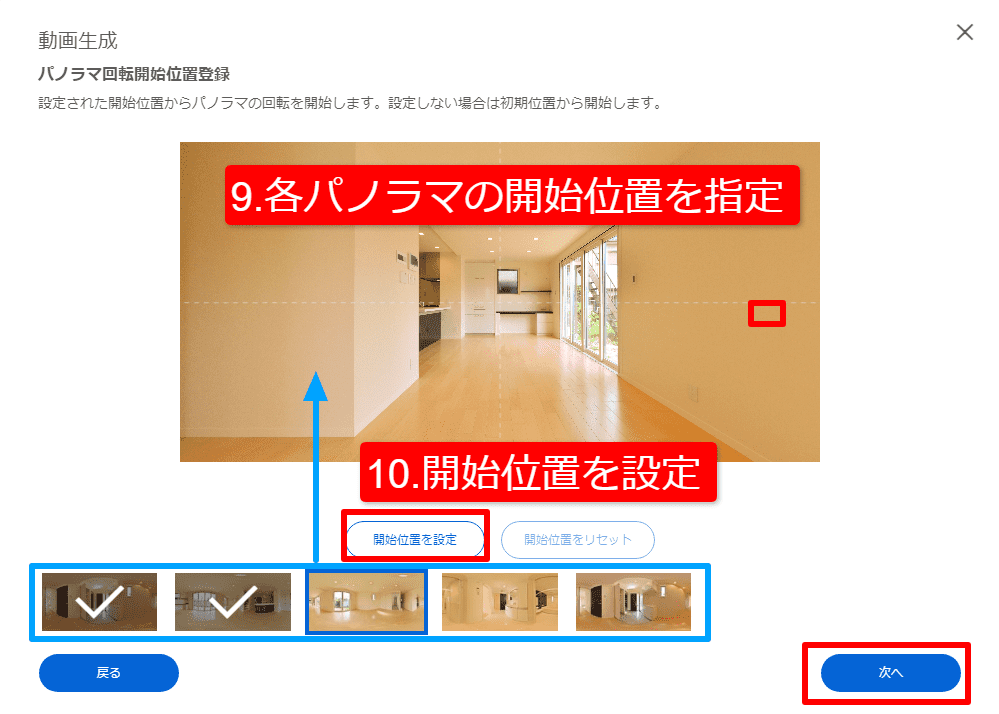 9. 各パノラマのプレビュー画面を回転させ開始位置を指定