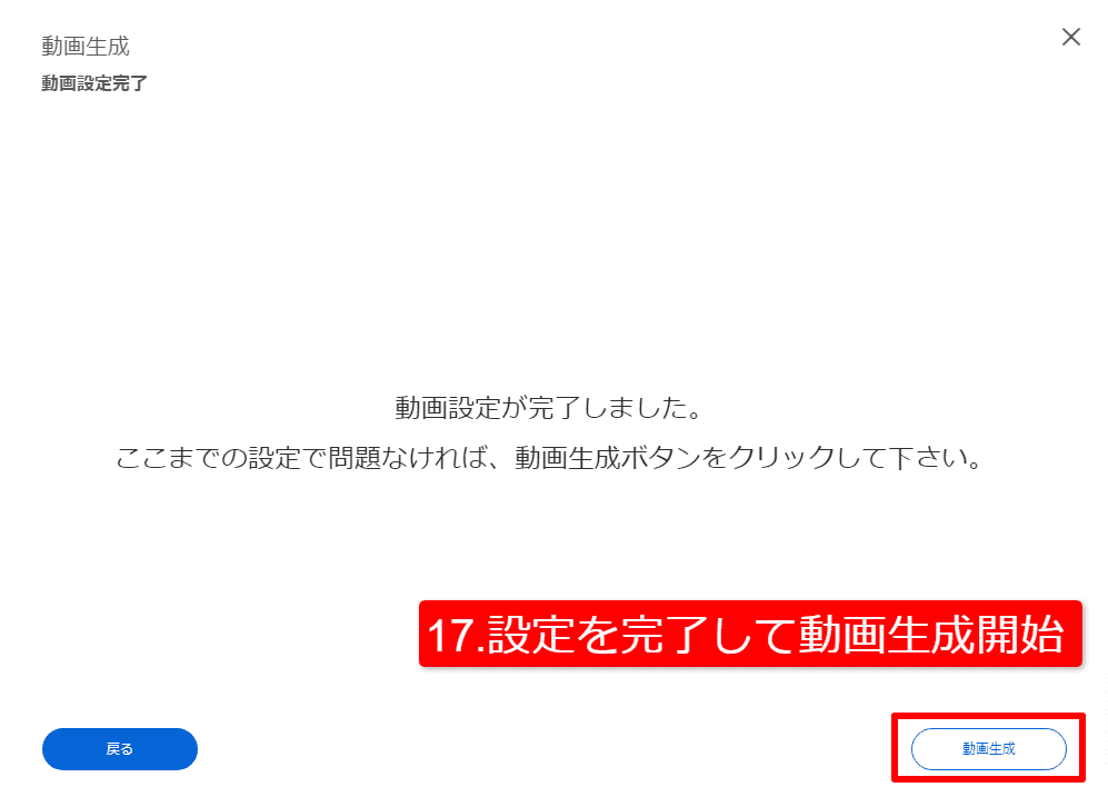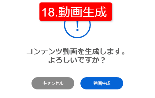 18.確認して「動画生成」をクリック、キャンセルで動画生成を中断