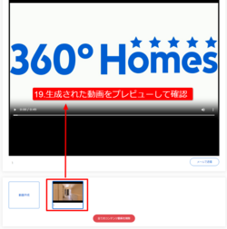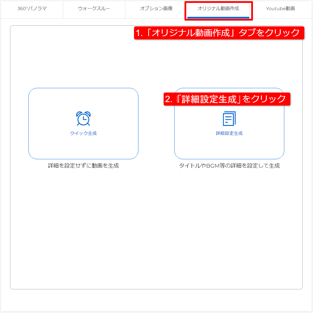 詳細設定生成:登録されたパノラマやオプション画像を使用し、テロップやBGMを設定して動画を生成します。