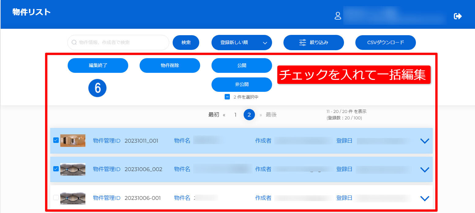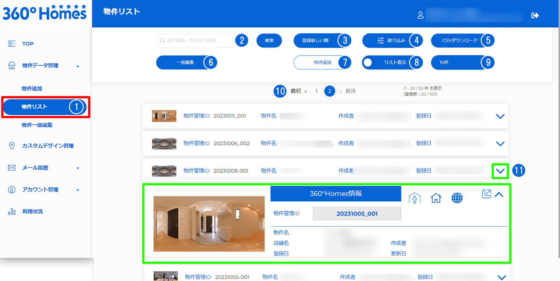 ① 物件リスト:登録済み360°物件を一覧表示します。