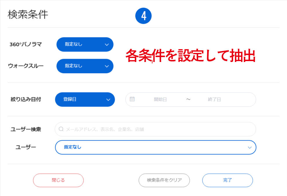 ④ 絞り込み:検索条件パネルを表示します。パノラマの有無、登録日、更新日の日付範囲の選択、ユーザーの複数条件から絞り込み検索ができます。