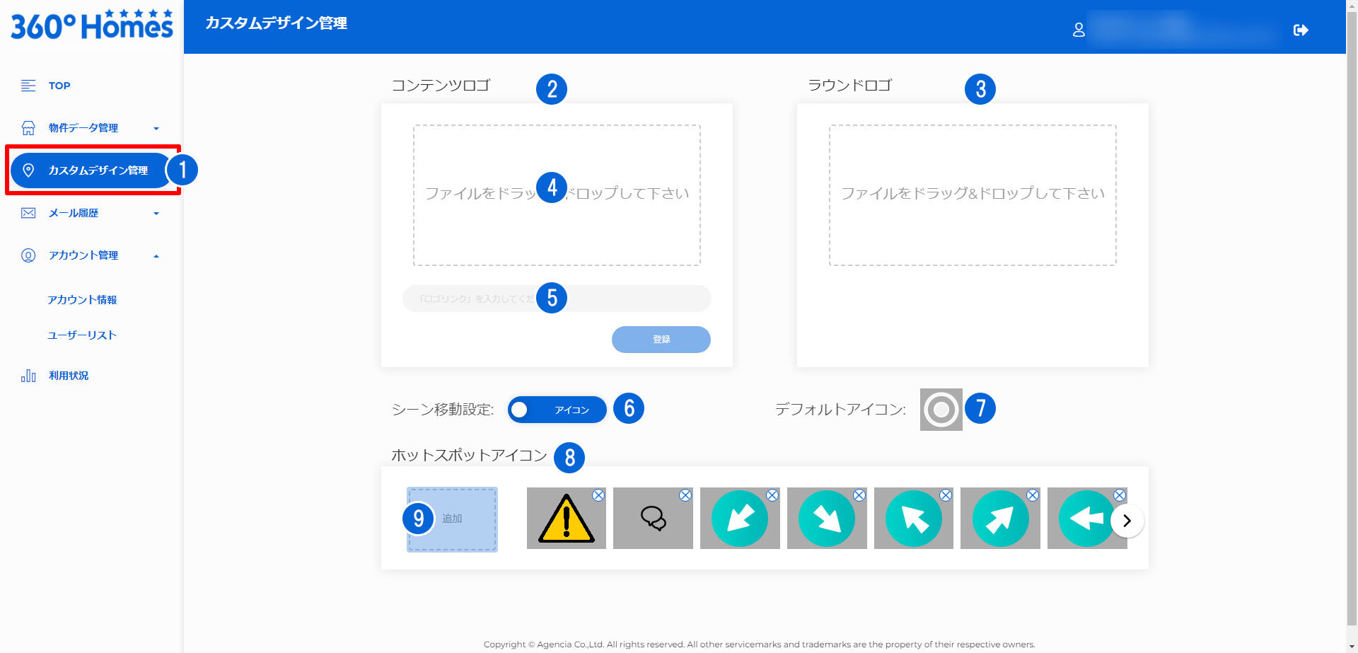 ⑧ ホットスポットアイコン:パノラマ内に設置するアイコンを登録できます。