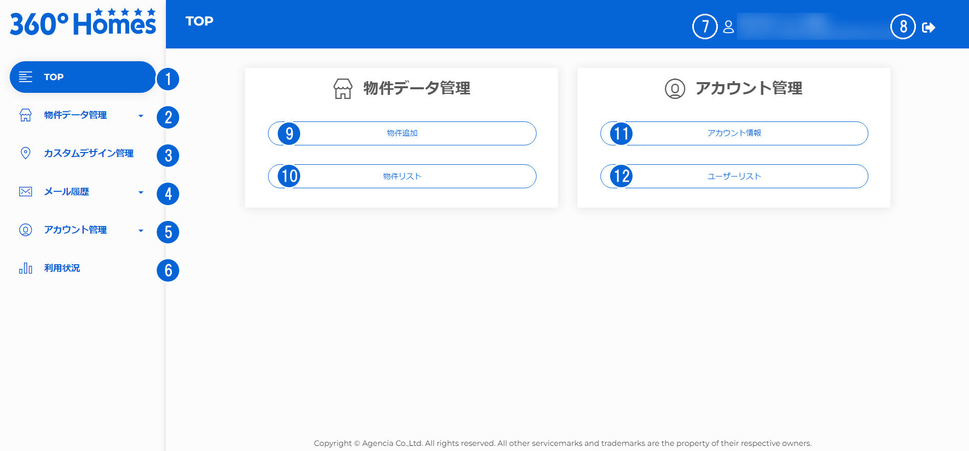 ⑦ アカウント表示:ログイン中アカウントが表示されます。